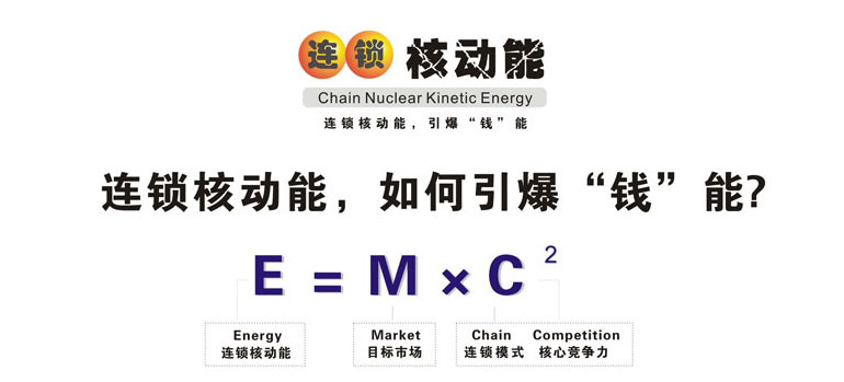 ,這是世界著名的愛(ài)因斯坦能量公式。基于愛(ài)因斯坦的相對(duì)論和能量公式,產(chǎn)生了原子彈和核電站,今天的人類(lèi)太空實(shí)踐證實(shí)了愛(ài)因斯坦理論的正確性,人類(lèi)因此發(fā)生了翻天覆地的變化。在愛(ài)因斯坦的能量公式中,M是質(zhì)量,C是光速,當(dāng)速度為光速時(shí),即使很小的質(zhì)量也能轉(zhuǎn)化為非常大的能量。 廣州采納企業(yè)管理顧問(wèn)有限公司首席咨詢(xún)師陳宏創(chuàng)建的的連鎖核動(dòng)能理論(全名:連鎖內(nèi)核能量裂變激增理論)是以愛(ài)因斯坦的能量公式為基礎(chǔ)創(chuàng)建,但其含義和指向是不同的:M=目標(biāo)市場(chǎng)(Market),C1=連鎖模式(Chain),C2 =核心競(jìng)爭(zhēng)力(Competition),其理論意義是,企業(yè)找準(zhǔn)了目標(biāo)市場(chǎng),以連鎖的方式經(jīng)營(yíng),核心競(jìng)爭(zhēng)力越大,推動(dòng)其發(fā)展能量就越大。 連鎖核動(dòng)能理論如何幫助連鎖企業(yè)“引爆錢(qián)能”快速發(fā)展?我們用深入淺出的圖形表達(dá)方式對(duì)該理論進(jìn)行分層闡述: